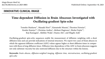 こちらはMRMS誌のInnovative Clinical Imageで報告したものとなります。Oscillating-gradient spin-echo (OGSE)法による拡散強調像では拡散時間の大幅な短縮化が可能となり、組織微細構造を推定できる手法として期待されています。脳膿瘍をOGSE法で解析し、脳膿瘍におけるADC値の拡散時間依存性は基質の粘性だけでなく内部構造の拡散制限を示唆していることを報告しました。すなわち、教科書的には「脳膿瘍が拡散強調像で著明な高信号を示すのは、粘性によるもの」とよく書かれていますが、粘性のみに由来しているのではなく、膿瘍内部の微細構造(炎症細胞、壊死組織の破片、フィブリン、細菌など)が大いに影響しているということです。