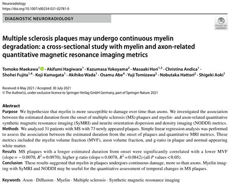 Maekawa T, Hagiwara A, Yokoyama K, Hori M, Andica C, Fujita S, Kamagata K, Wada A, Abe O, Tomizawa Y, Hattori N, Aoki S. Multiple sclerosis plaques may undergo continuous myelin degradation: a cross-sectional study with myelin and axon-related quantitative magnetic resonance imaging metrics Neuroradiology. 2021 Aug 12. doi: 10.1007/s00234-021-02781-0.