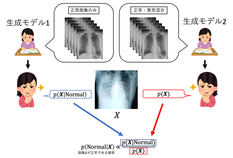 直感的な説明は少し難しいですが、対象が胸部単純写真だとすると、右辺の分子は「正常胸部単純写真としてのもっともらしさ」、分母は「(正常異常問わず) 胸部単純写真としてのもっともらしさ」です。たとえば異常な胸部単純写真を入力すると、分子が小さく、分母が大きくなるので「正常である確率」は低くなります。