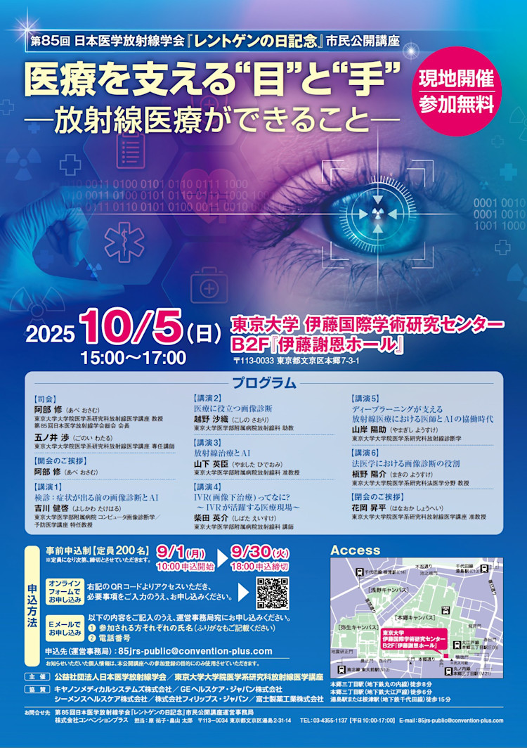 本市民公開講座は、一般の皆様から医療関係者までを対象に、現在および近未来の放射線医学に関する幅広いトピックをお聞きいただき、放射線医学の魅力と現代医療に果たす役割を広く伝えることを目的としています。