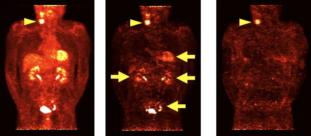 以下の図において、左の今回PET画像では頚部の真病変 (▶) のほかに、肝や心筋などの正常臓器にも多数の生理的集積が描出されています。中央の単純な差分画像においても、真病変のほかに偽陽性として心筋や尿路も描出されてしまっています (→)。右の提案手法では真病変のみが描出できているのが分かります。